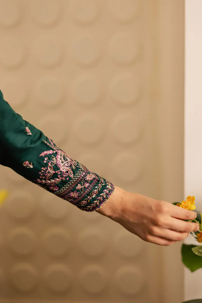 A charming embroidered panelled green khaddar long maxi designed with a flattering square neckline and fitted embroidered sleeves, offering a playful yet refined silhouette. The intricate detailing adds texture and elegance to this standout piece.