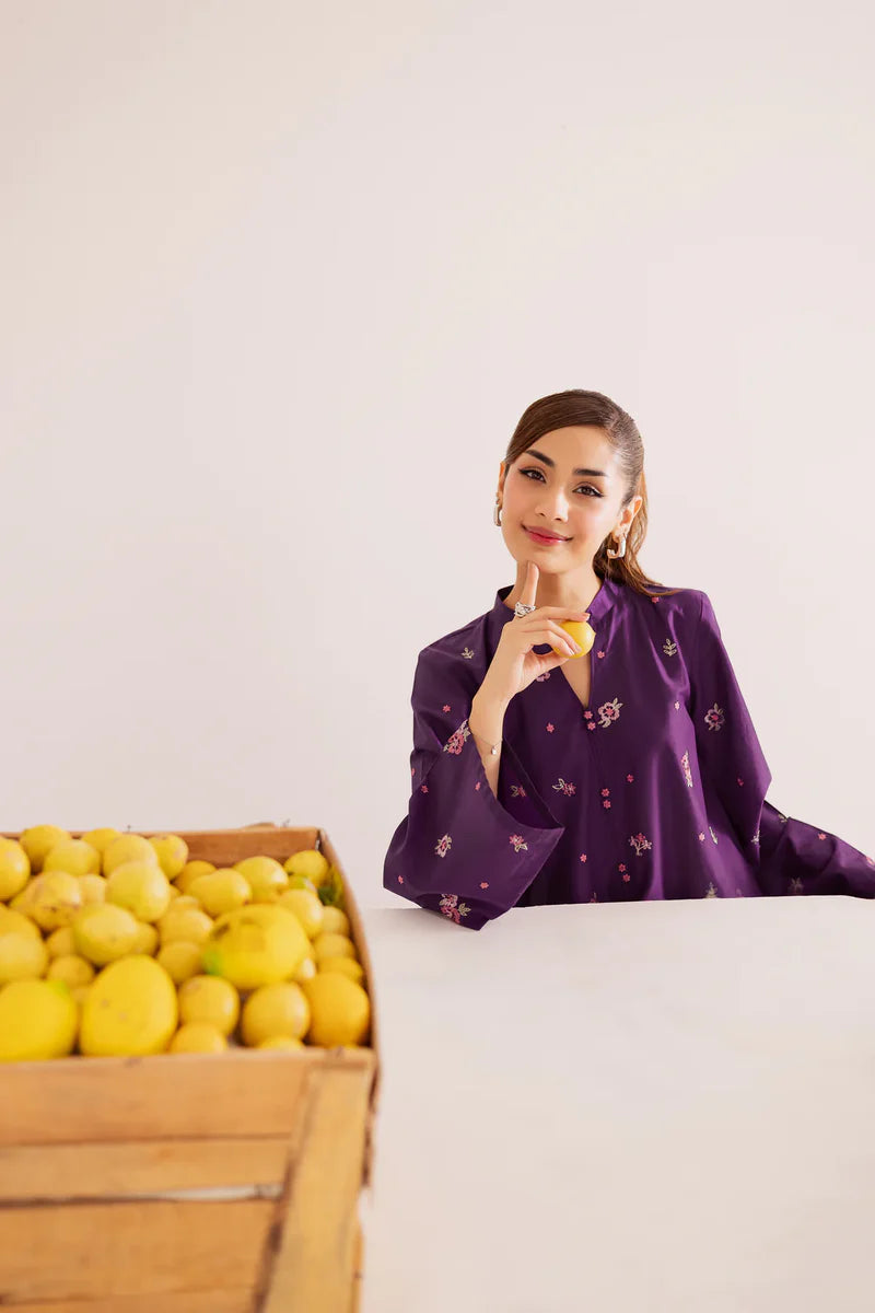 This purple pima lawn co-ord set brings a fresh, feminine touch to everyday wear. The shirt is adorned with soft pink floral embroidery, artfully spread across the front and sleeves for a delicate and graceful look. Cute button details along the neckline add a charming accent, elevating the simple silhouette with playful elegance.